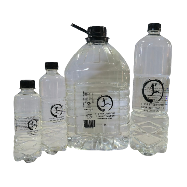 Sterkfontein Spring Water, still and sparkling, packaged in 330ml, 500ml, 1L, 1.5L, 2L, and 5L bottles for retail and on-the-go service. Available in cases for bulk supply.
