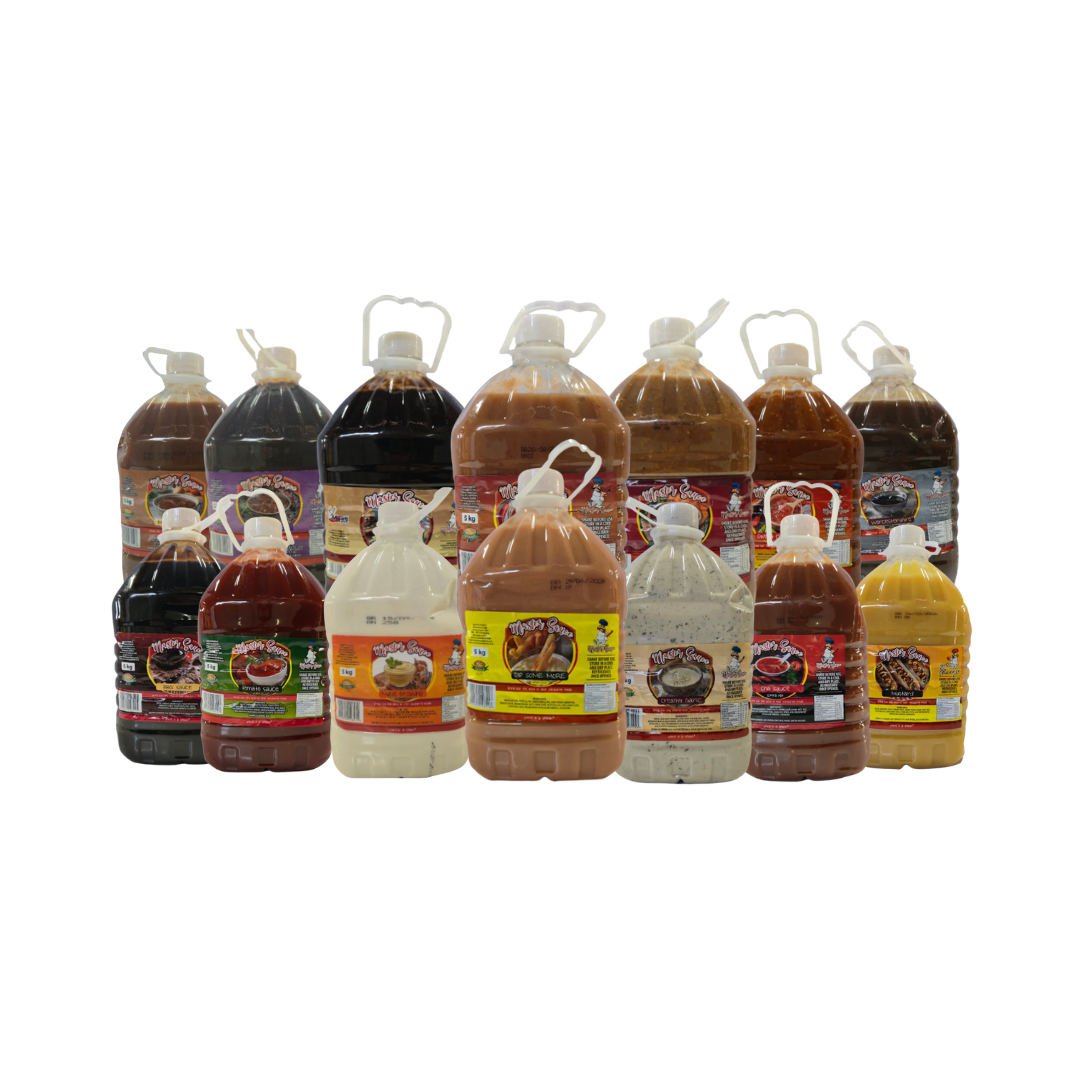 High-demand sauces like Tomato, Chilli, BBQ, Garlic, Monkey Gland, Mustard, Chutney, Worcester, and Peri Peri available in bulk 2L and 5L sizes.