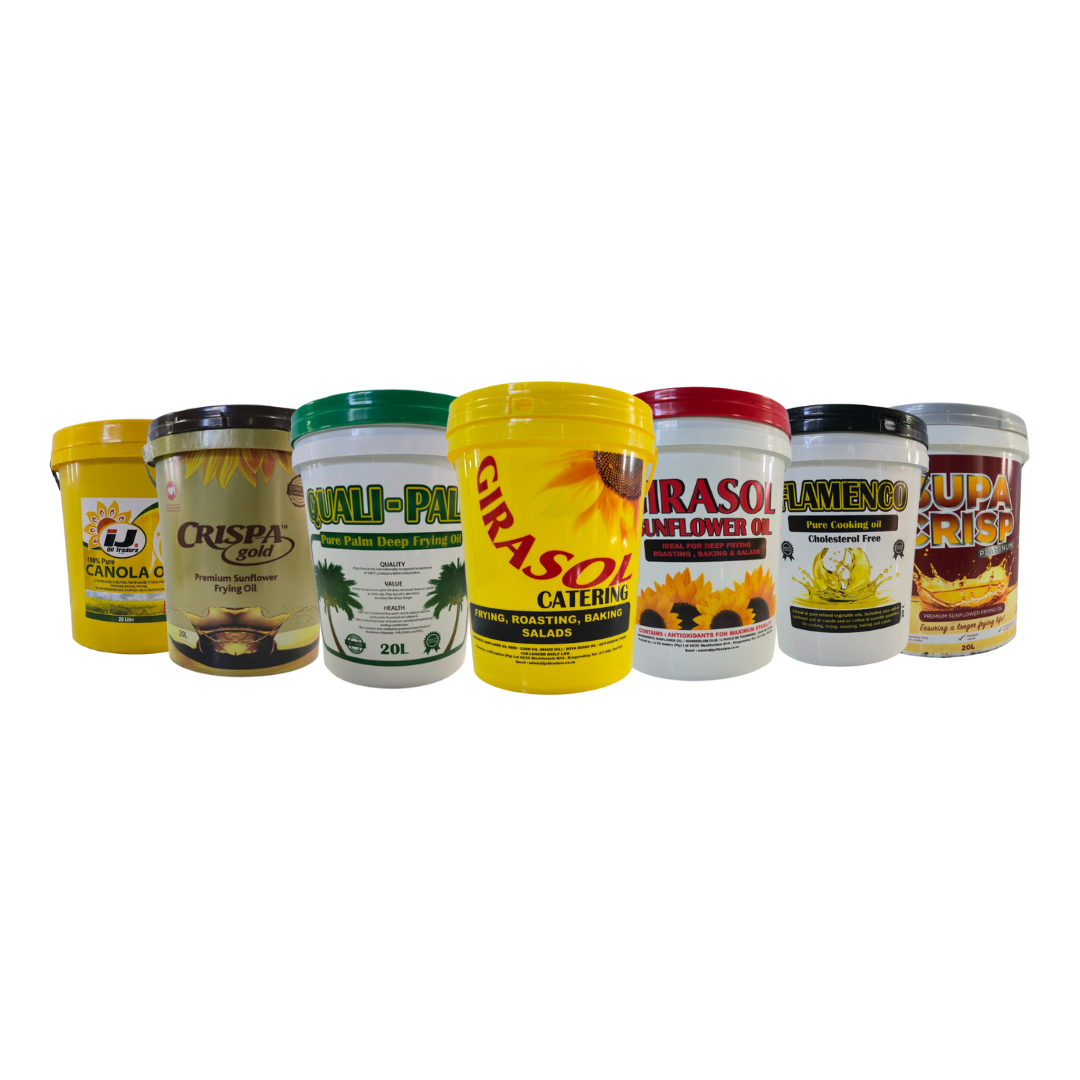 A full range of bulk options including Girasol (pure sunflower), Flamenco (blended oil), Palm Oil, Canola, Crispa Gold, Supa Crispa, Girasol Catering and Frieburg — available in sizes from 5L to 20L for catering and resale.